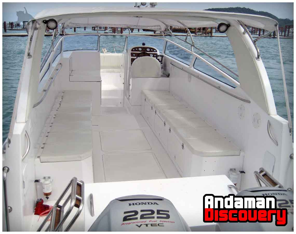 Our speedboat is powered by two Honda 4-stroke 225 HP high-performance engines. In just 1hr30 we reach from Koh Phayam the exciting dive site Richelieu Rock. When we head to the Surin Islands from Koh Phayam, we also need about 1h30. When we go to the area of Koh Ra, Koh Phratong and Koh Kham, we get there from Koh Phayam in about 45 minutes to 1h30, depending on the destination.